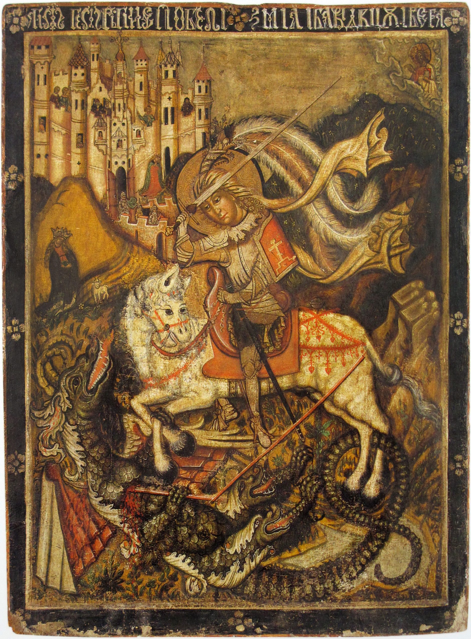 “Юрій Змієборець” ——— “Св. Георгій” розписи Софії Київської, кін 11 ст. ——— “Св. Георгій перед Діоклетіаном” розписи Софії Київської, кін 11 ст. ——— “Св. Георгій і св. Федір” шиферна плита Михайлівського Золотоверхого, 12 ст ——— “Святий Юрій” Рельєф порталу собору Георгія в Юр’єві Польськму. – 1234 р. ——— “Святий Юрій” з Княжої гори, Київ 13ст.…